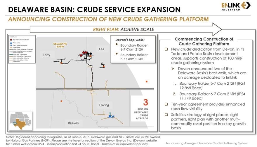 Avenger is the third crude oil gathering platform in a high-growth basin that EnLink has announced over the last two years. EnLink is not constructing or operating Avenger.