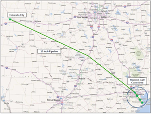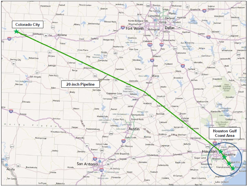 The pipeline delivers crude oil from Colorado City in West Texas to Houston, with further connectivity for BridgeTex shippers to the Texas City area. At Colorado City, BridgeTex pipeline sources crude oil from Plains’ Basin and Sunrise pipeline systems. BridgeTex delivers volumes into Magellan’s East Houston terminal and Magellan’s Houston crude oil distribution system with connection to refineries in Houston and Texas City as well as to marine export capabilities via Magellan’s Seabrook Logistics joint venture terminal.
