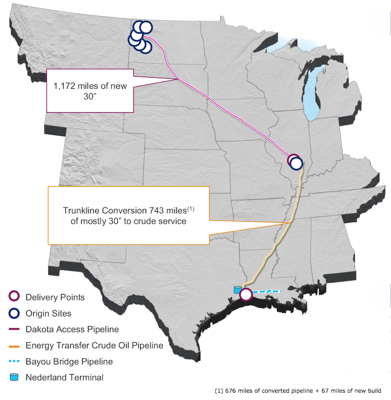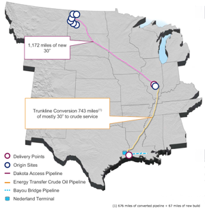 ET's combined 1,915-mile Bakken Pipeline System includes the ETCO pipeline and Dakota Access pipeline (DAPL), an 1,172-mile, 30-inch crude oil line originating at six terminal locations in the North Dakota counties of Mountrail, Williams and McKenzie and delivering to a hub outside of Patoka, Illinois.