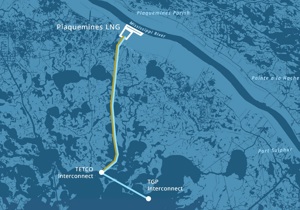 The 630-acre Plaquemines project site is located on the Mississippi River, about 20 miles south of the Port of New Orleans. It also would be supplied through TETCO connection via the proposed Gator Express pipeline project, to be developed in phases, starting with a 15-mile, 42-inch pipe, followed by construction of a 12-mile looped section of 42-inch pipeline.