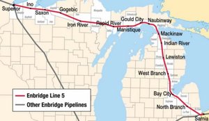 Snyder and his team are working on several fronts to finalize an agreement with Canadian oil transport giant Enbridge to replace the underwater segment of its Line 5, which carries about 23 million gallons (87 million liters) of oil and natural gas liquids daily between Superior, Wisconsin, and Sarnia, Ontario, traversing large sections of northern Michigan. A more than 4-mile-long (6.4-km) section, divided into two pipes, lies on the floor of the churning Straits of Mackinac.