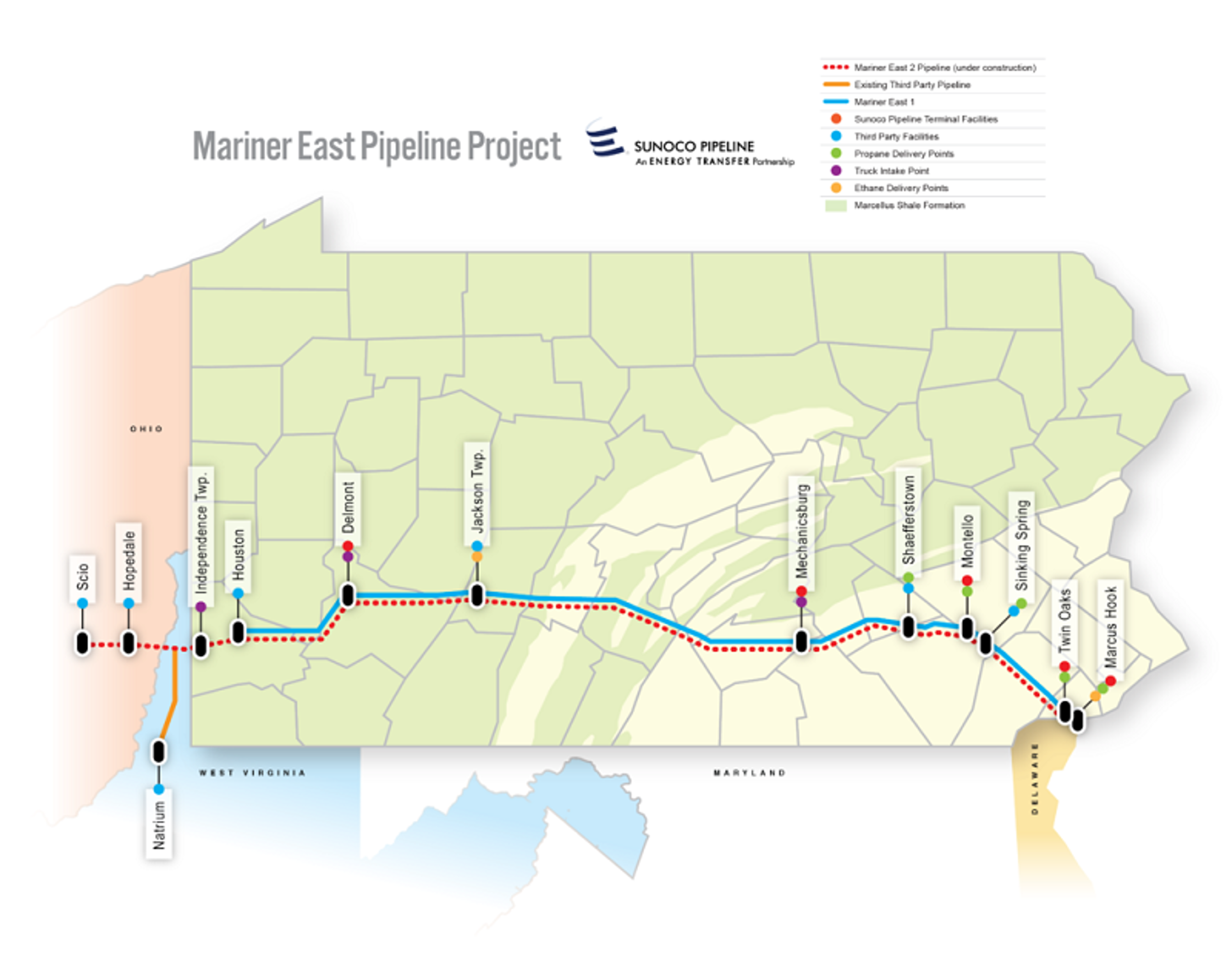 Mariner East transports liquids from the Marcellus and Utica shale fields in western Pennsylvania to customers in the state and elsewhere, including international exports from Energy Transfer's Marcus Hook complex near Philadelphia.