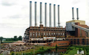A Detroit gas-fired electric generating plant that was more than 100 years old was demolished Friday to accommodate a Jeep factory.