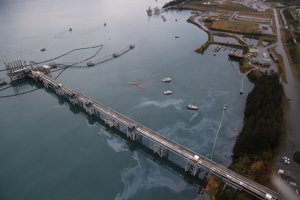 A sump overflow spilled oil into the water at the terminal on Sunday night. By Wednesday, clean-up crews had recovered 574 barrels (24,108 gallons) of an oil-water mix, authorities said.