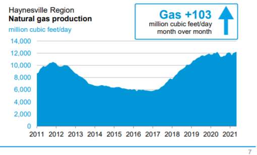 The U.S. Energy Information Administration’s April report, which reflects drilling data through March, projects new-well gas production per rig will increase by 12,000 cubic feet/day month-over-month in May in the Haynesville Region.