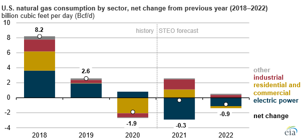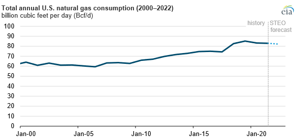 EIA’s April Short-Term Energy Outlook forecasts decreased total U.S. natural gas consumption in 2021 and 2022 following a decline in 2020.