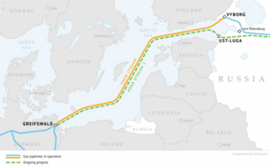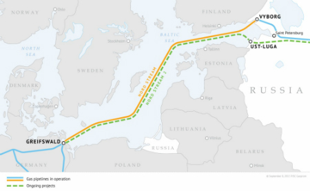The pipeline is mostly complete but around 120 km is left to be laid in Danish waters as well as almost 30 km in German waters, before it makes landfall at the northern German coastal town of Lubmin, near Greifswald.