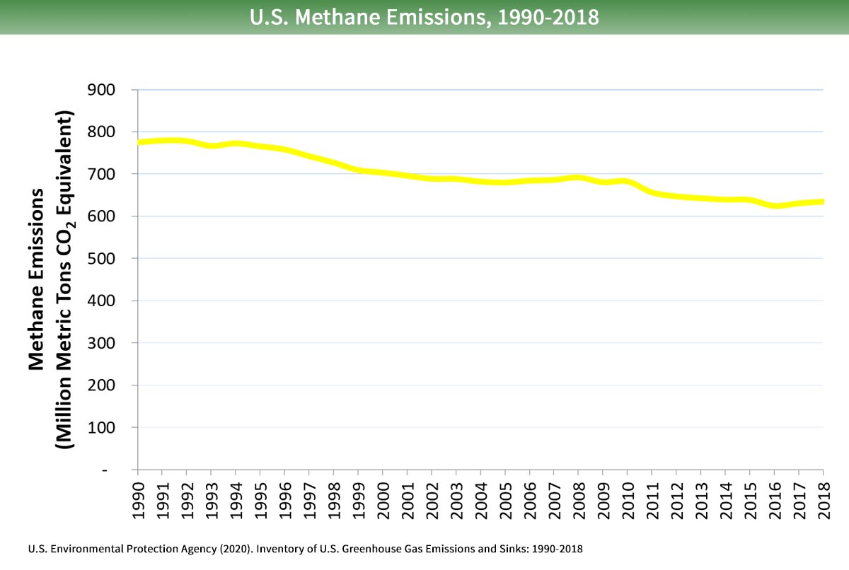 United States methane emissions decreased by 18.1% from 1990 to 2018, according to the Environmental Protection Agency. The top source of methane emissions is agriculture, followed by energy and industry.