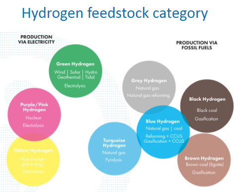 GEI uses a color-coding system to show eight different types of feedstocks and their associated GHG footprints, because while hydrogen is a clean fuel that produces no emissions other than water when consumed, the processes that produce and deliver hydrogen can result in carbon emissions, Bush said.