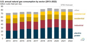 The Energy Information Administration forecasts natural gas consumption will decline in all end-use sectors in the U.S. except in the industrial sector and for other non-sector-specific uses (lease and plant fuel, pipeline and distribution use, and vehicle use).