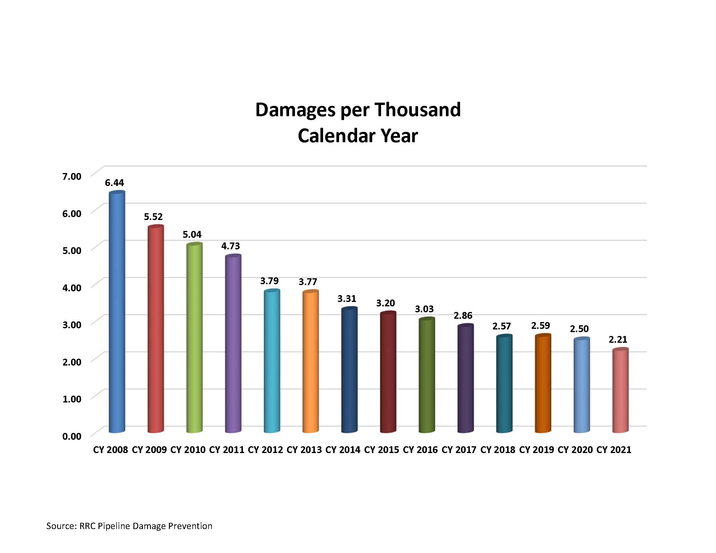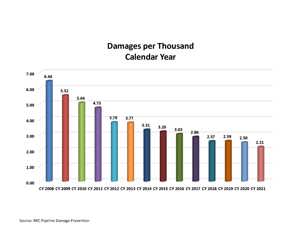 The rate of pipeline incidents actually dropped in 2021 to 2.21 incidents per 1,000 calls to locate; the rate was 2.5 incidents per 1,000 calls in 2020. The rate has been steadily dropping since the first full year of recordkeeping started in 2008 when there were 6.44 pipeline incidents per 1,000.