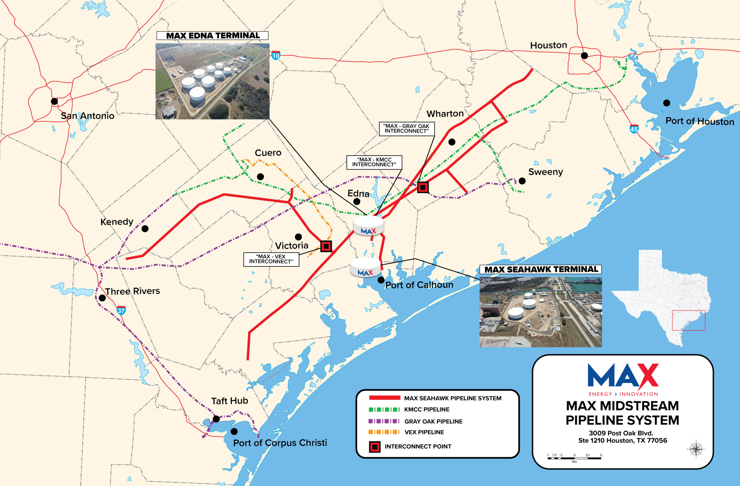 Max is also developing plans to connect its growing pipeline system to both the Houston and Corpus Christi markets. This will provide customers with more options for crude movements. Ultimately, this will allow customers the ability to utilize the Port of Calhoun to better optimize their logistics compared to more congested ports. Max will be able to transport crude via pipelines between the major export ports of Houston, Corpus Christi and Calhoun including connected header systems in Edna, Three Rivers, Taft and Helena. And, Max will continue to develop all assets within the commitments of maintaining a carbon-neutral export facility.