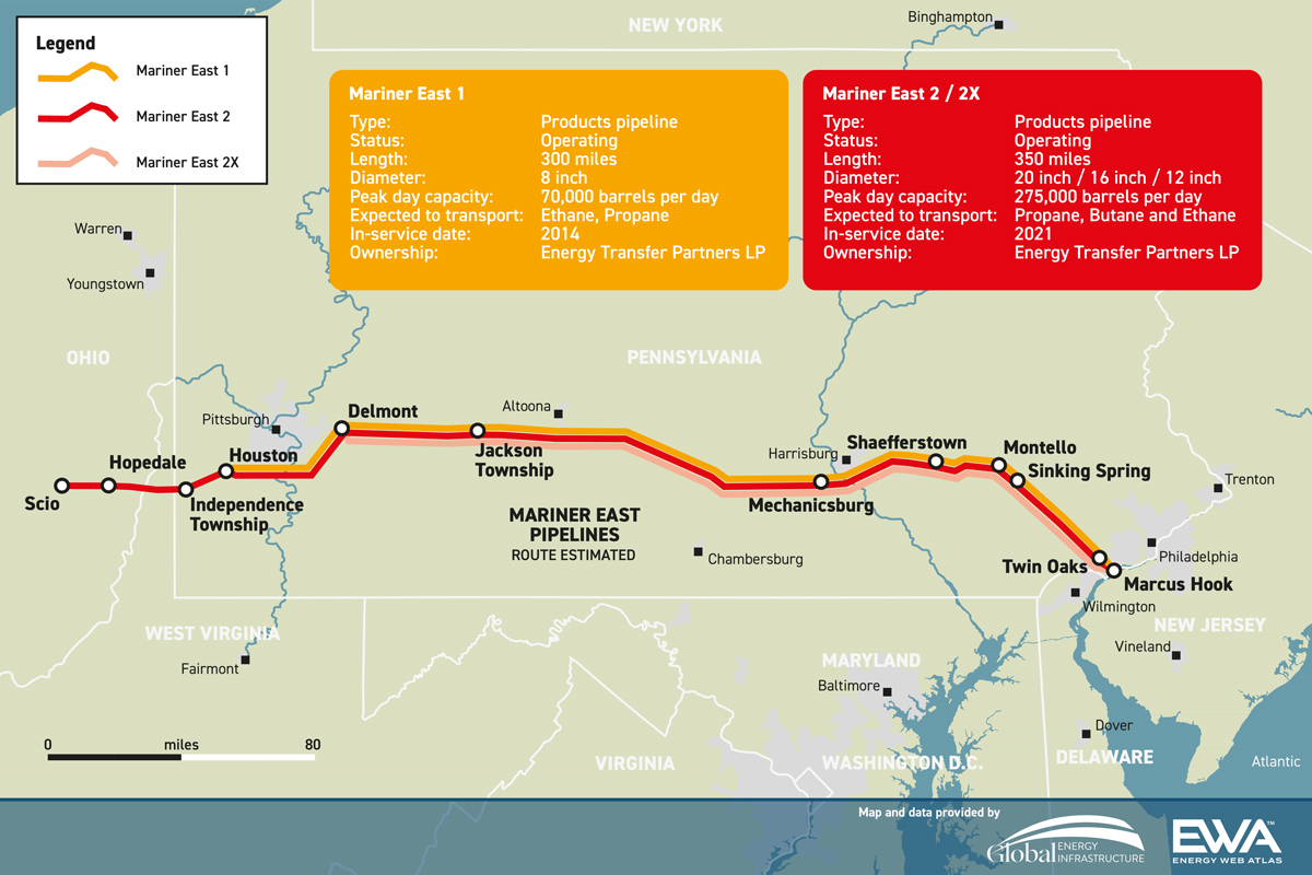 Mariner East 1’s propane and ethane lines entered service in 2014 and 2016, respectively. Mariner East 2 and Mariner East 2X are parallel lines that expand the network and will provide propane, ethane and butane services, the company said.