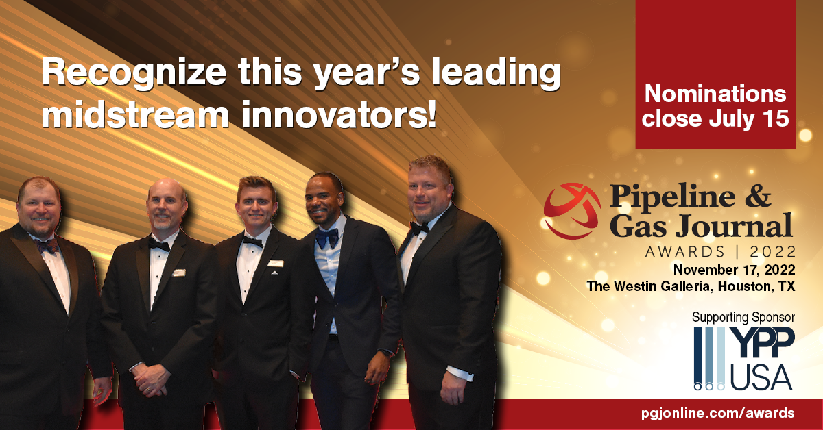 Pipeline & Gas Journal is accepting nominations for its annual Pipeline & Gas Journal Awards, which will honor the midstream energy segment’s leading innovations and outstanding personal contributions to the industry.