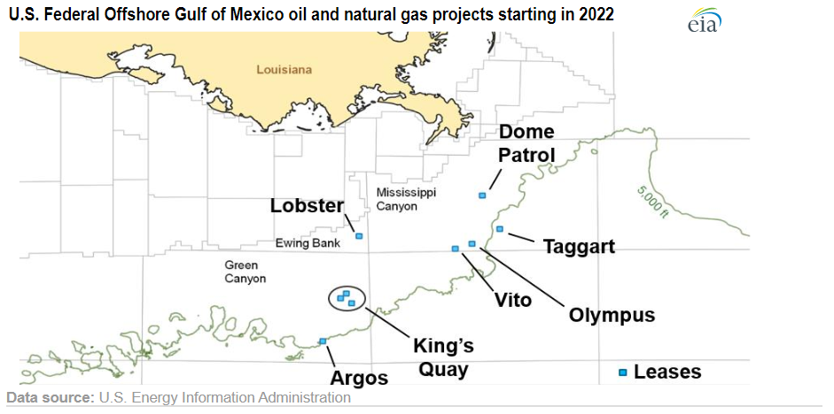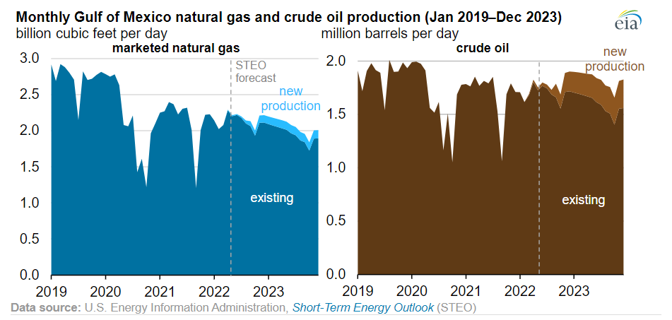 The U.S. Energy Information Administration forecasts that new fields coming online in 2022 will account for 5% of natural gas production and 14% of crude oil production in the U.S. Federal Offshore Gulf of Mexico by the end of 2023.