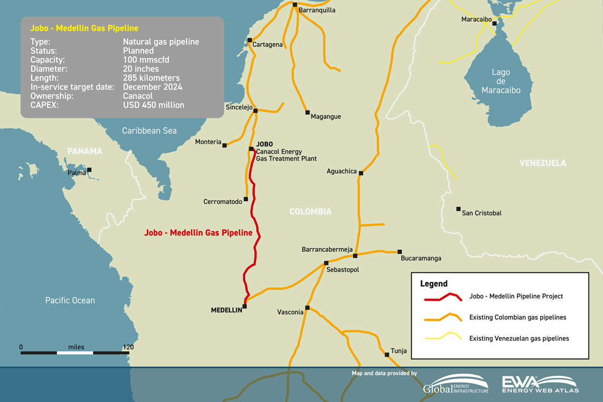 The 300-km (186-mile) pipeline is expected to begin operating by December 2024, initially transporting 100 million cubic feet a day (MMcf/d) from natural gas fields near the Caribbean coast to Colombia's second largest city.
