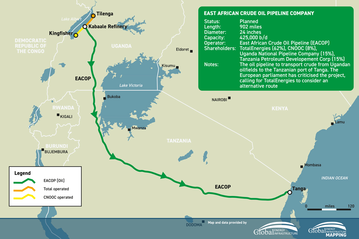 The company holds a 62% stake in EACOP, which will run 1,443 kilometers (897 miles) from Uganda’s Lake Albert oilfields to the port of Tanga in Tanzania, with the capacity to send up to 246,000 barrels of crude per day out to world markets as early as 2025.