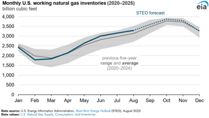 The EIA noted that U.S. natural gas production outpaced consumption at the start of the 2025 injection season, which runs from April through October. Inventories were 7% above the five-year (2020–24) average as of Aug. 8, compared with 4% below average at the end of March.