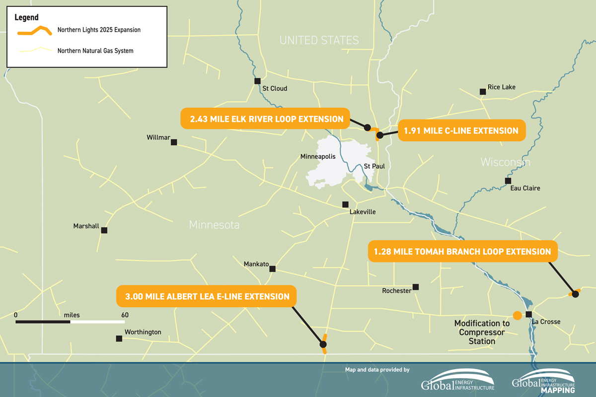 The Northern Lights 2025 Expansion Project is set to boost natural gas capacity across Minnesota and Wisconsin, with key pipeline extensions and upgrades planned for completion by November 2025.